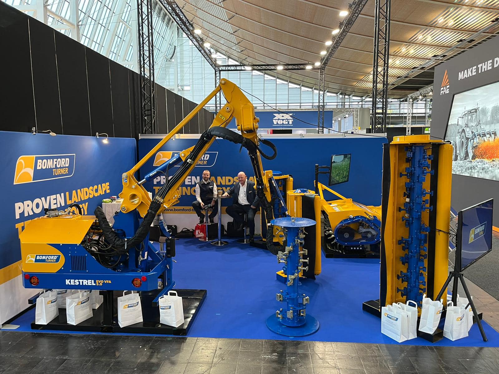 On the stand see the Kestrel Evo VFA 5.0 reach arm mower, the Dyna-Drive ground-driven cultivator plus a selection of flailheads and flails.
