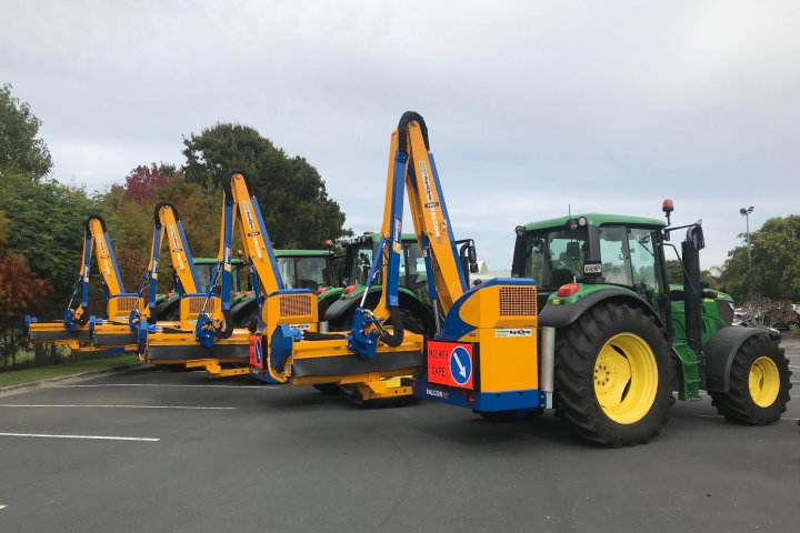 A fantastic image sent to us by our Importer in New Zealand – AgriQuip. Recently Mark Hamilton from AgriQuip sold these 4 x Falcon 5.5 machines equipped with 1.5m Pro Cut cutting heads to Recreational Services, near Auckland.